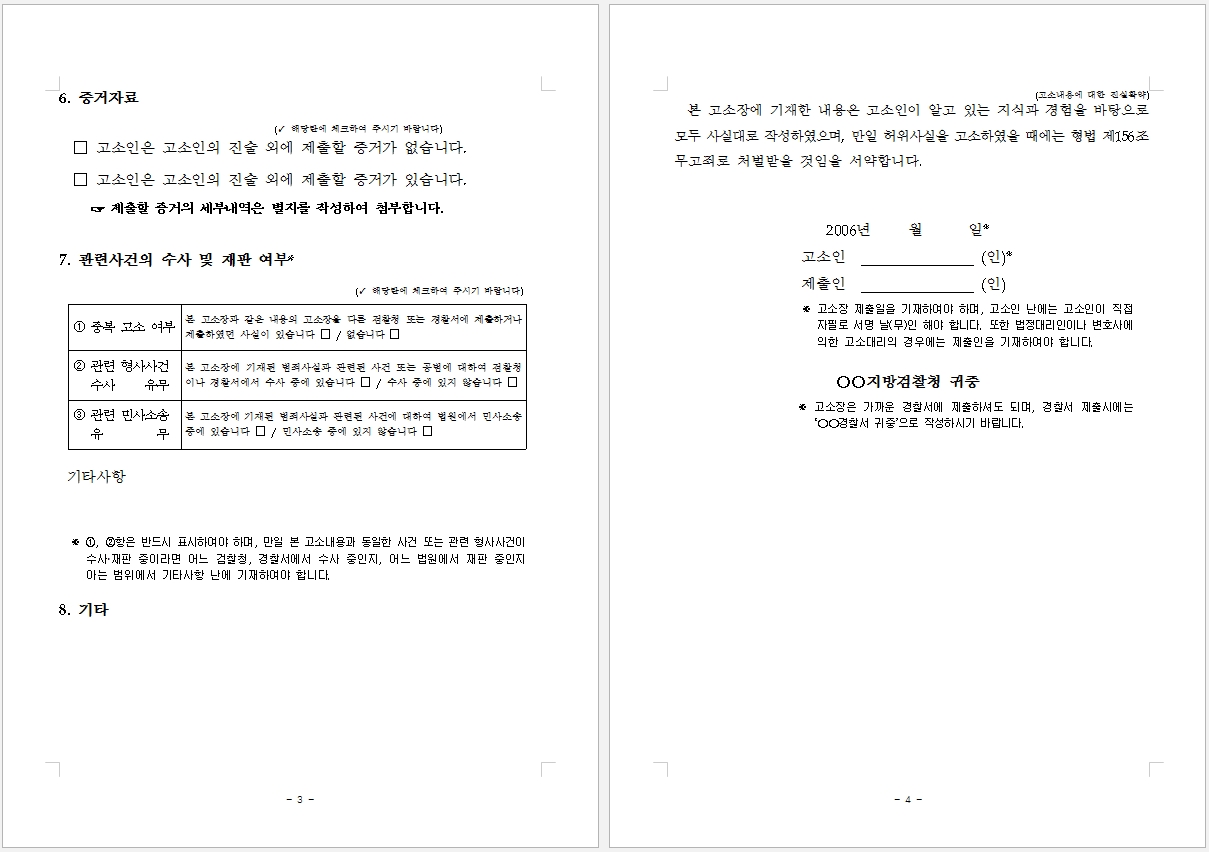 전문가의 도움을 받아 고소장 작성을 할 수 도 있지만 비용이 부담되고 번거롭다면 알려드린 고소장 작성 요령을 참고하여 작성하되 경찰서에 방문하여 적는 것 보다 미리 작성 후 출력해 가는것이 편하실 수 있습니다. 총 6페이지며 필요한 부분만 작성하시면 됩니다.